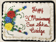 Dianne Zimmerman The Sun Lakes Duplicate Bridge Club celebrated its 30th anniversary year with a duplicate bridge team game at Risen Savior Lutheran Church. There were 27 tables of bridge players, and after the game, we celebrated with delicious cake and sparkling cider beverages. If you have interest in participating in our multi-weekly games, please…