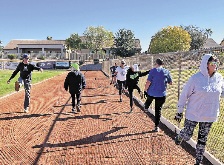 Coach Scott Steinmann leads the Lady Sluggers in warm-ups prior to a recent practice.