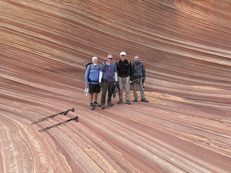 Hiking Club members enjoying “The Wave” near Page, Ariz., thanks to winning a lottery slot for last March (left to right): Bob Faulkner, Ted Maresh, Gene Jencsok, Ed Molieri (photo by Warren Wasescha)