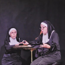 Newcomer Sue Stills was the perfect Sister Philamena, calm and devout to her toes. Her cohort in wine-crime, Sister Augusta, was superbly played by veteran actress Joyce Recupido. The two of them hatched plot after plot to keep the wine flowing and the convent open, unwittingly complicating everyone else’s self-serving plots in this series of mistaken identities and shenanigans. Mother Superior, played very convincingly by Susan Schlesinger, had her hands full with extra nuns, visiting priests, and a rekindled love affair. She handled it all with aplomb.